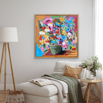 Inspired by memories of family meals, homemade treats and creative moments around the kitchen table, this collection celebrates connection and comfort. Each piece embraces quirky, imperfect charm — just like real life. Bursts of flowers reflect the joy of Mum’s beloved spring garden. These artworks belong in the heart of the home… your kitchen table.