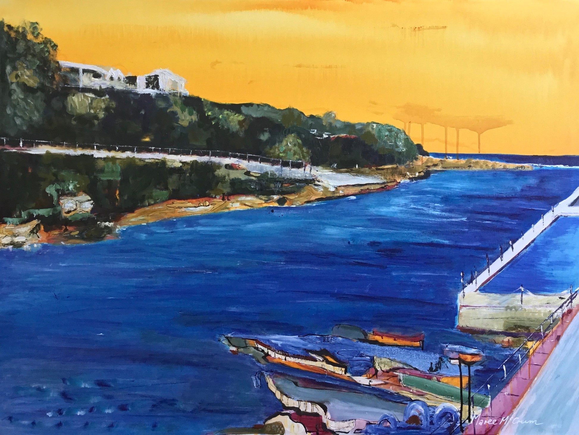 Using only 3 colours plus white, this work is built of layers and textures. The sea is calm there, there are no waves, just gentle lapping on the edges around this tranquil place.
