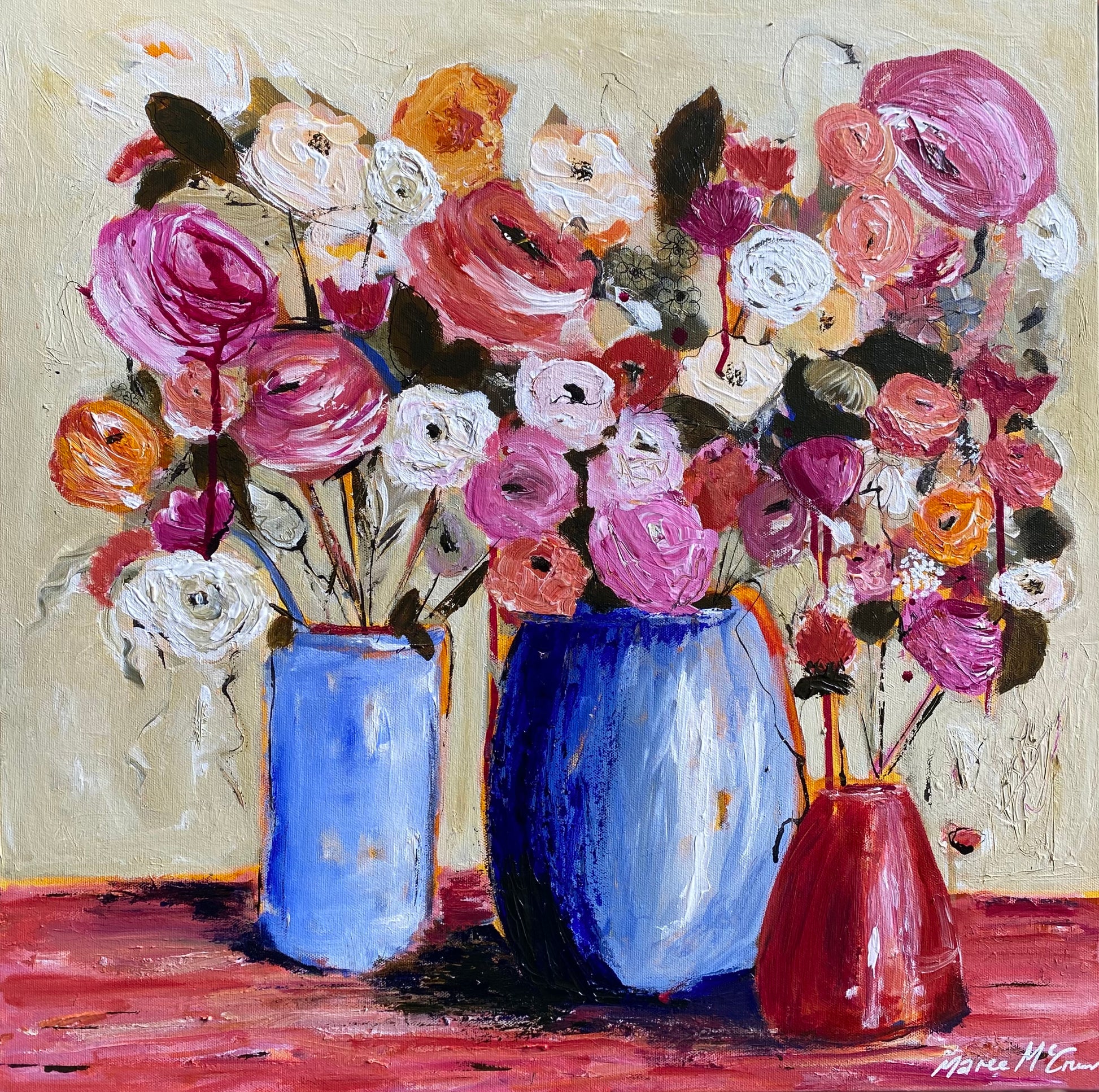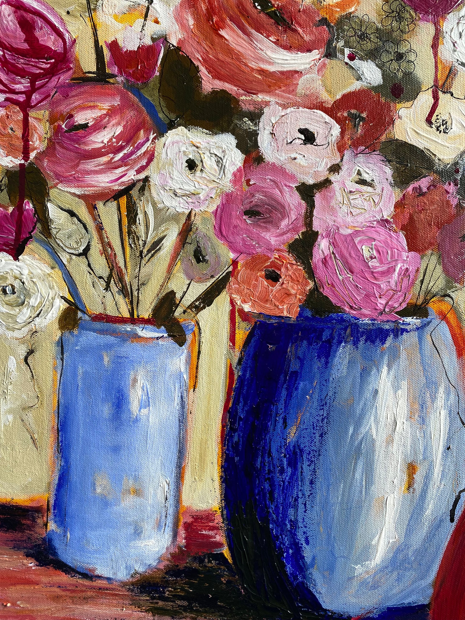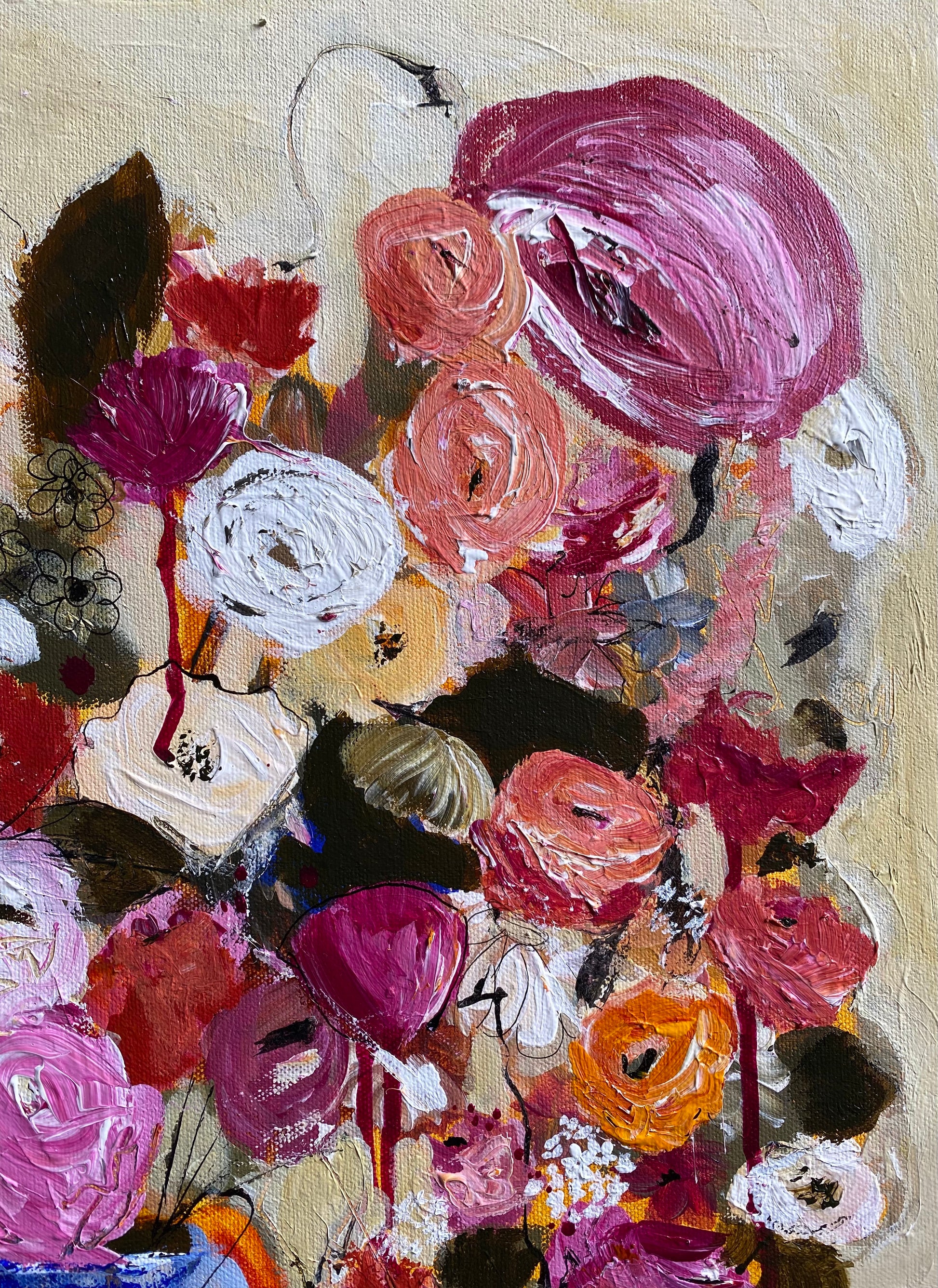 Using a colour palette of only 3 plus white, these soft glorious David Austin roses beg to be adored. Full of textures and mixed media comprising of charcoal, inks and acrylics.