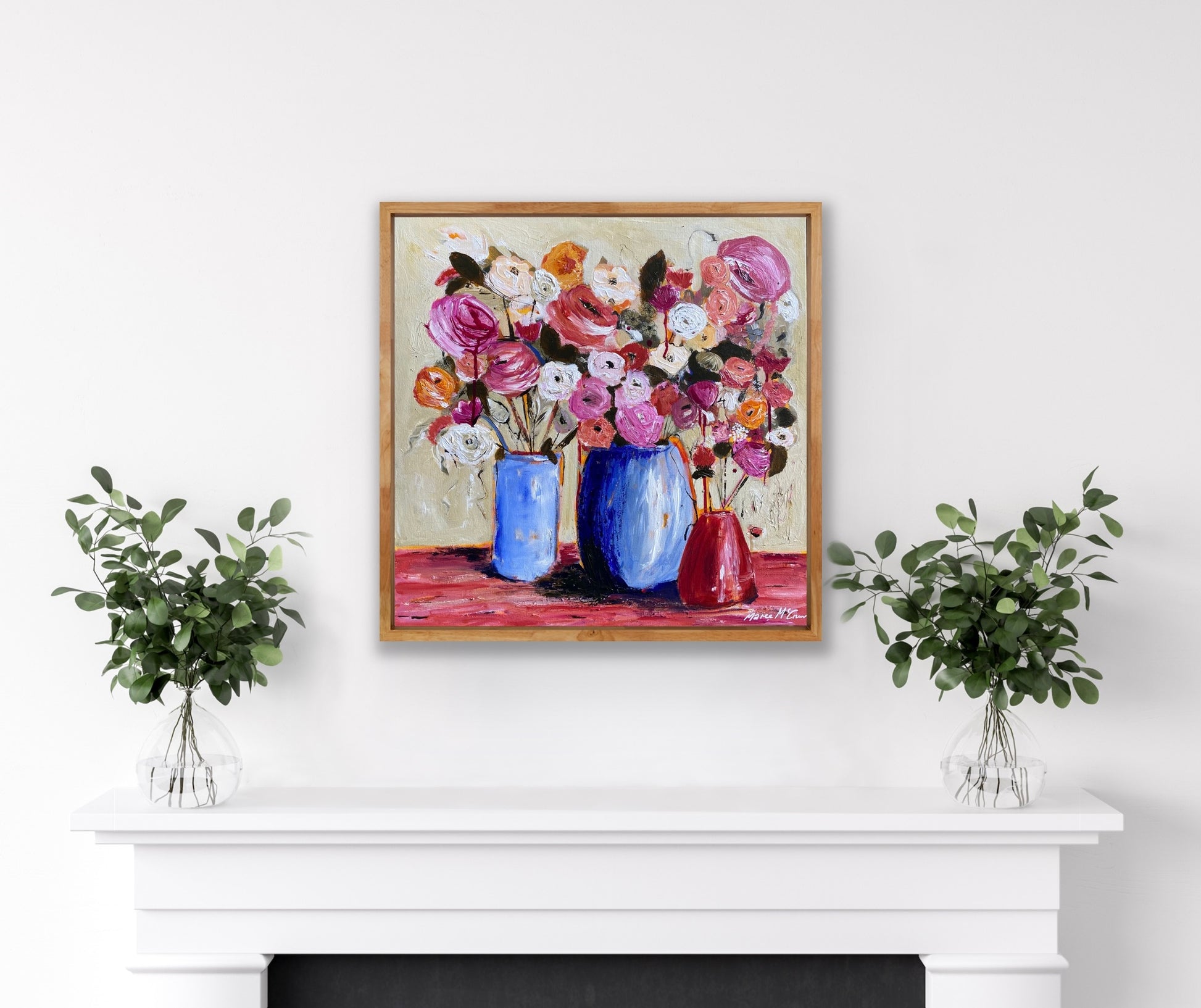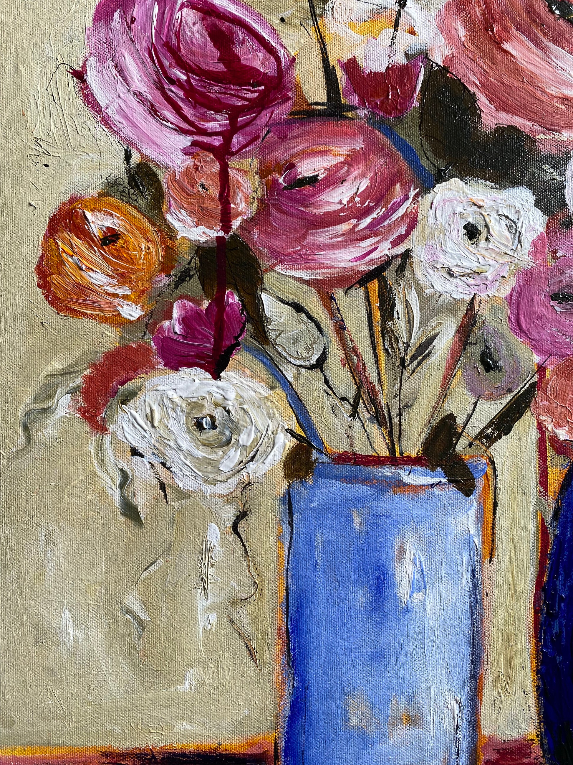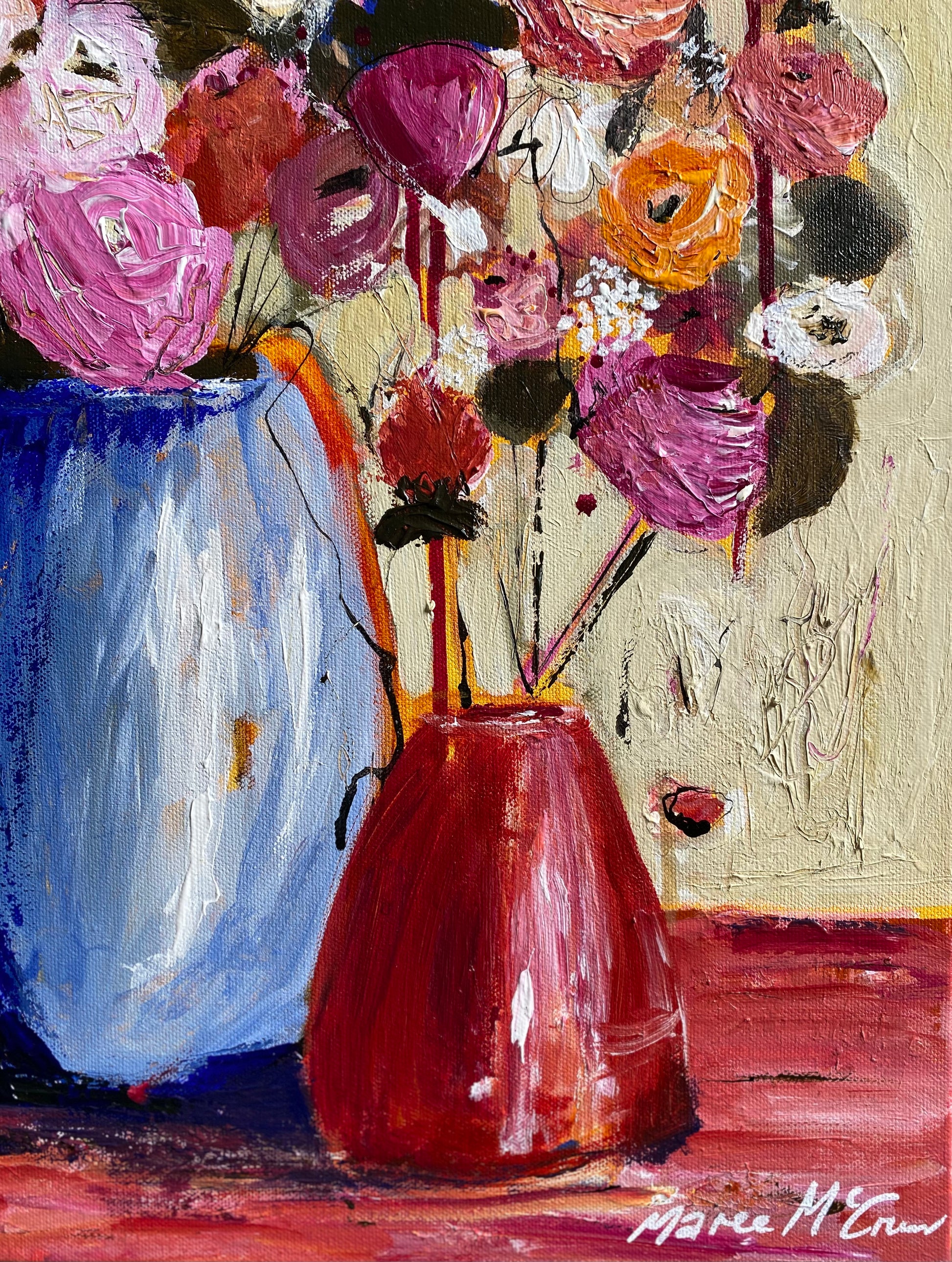 Using a colour palette of only 3 plus white, these soft glorious David Austin roses beg to be adored. Full of textures and mixed media comprising of charcoal, inks and acrylics.