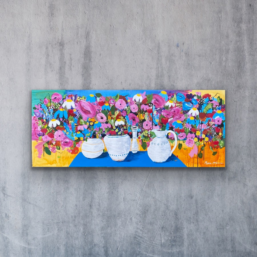 As part of the Art on the Kitchen Table Collection my inspiration was when my mum would be asked to provide flowers for a function. The vases, vessels, jugs and anything that held flowers would all sit on the kitchen table with blooms picked from her garden. It seemed there were always flowers everywhere!