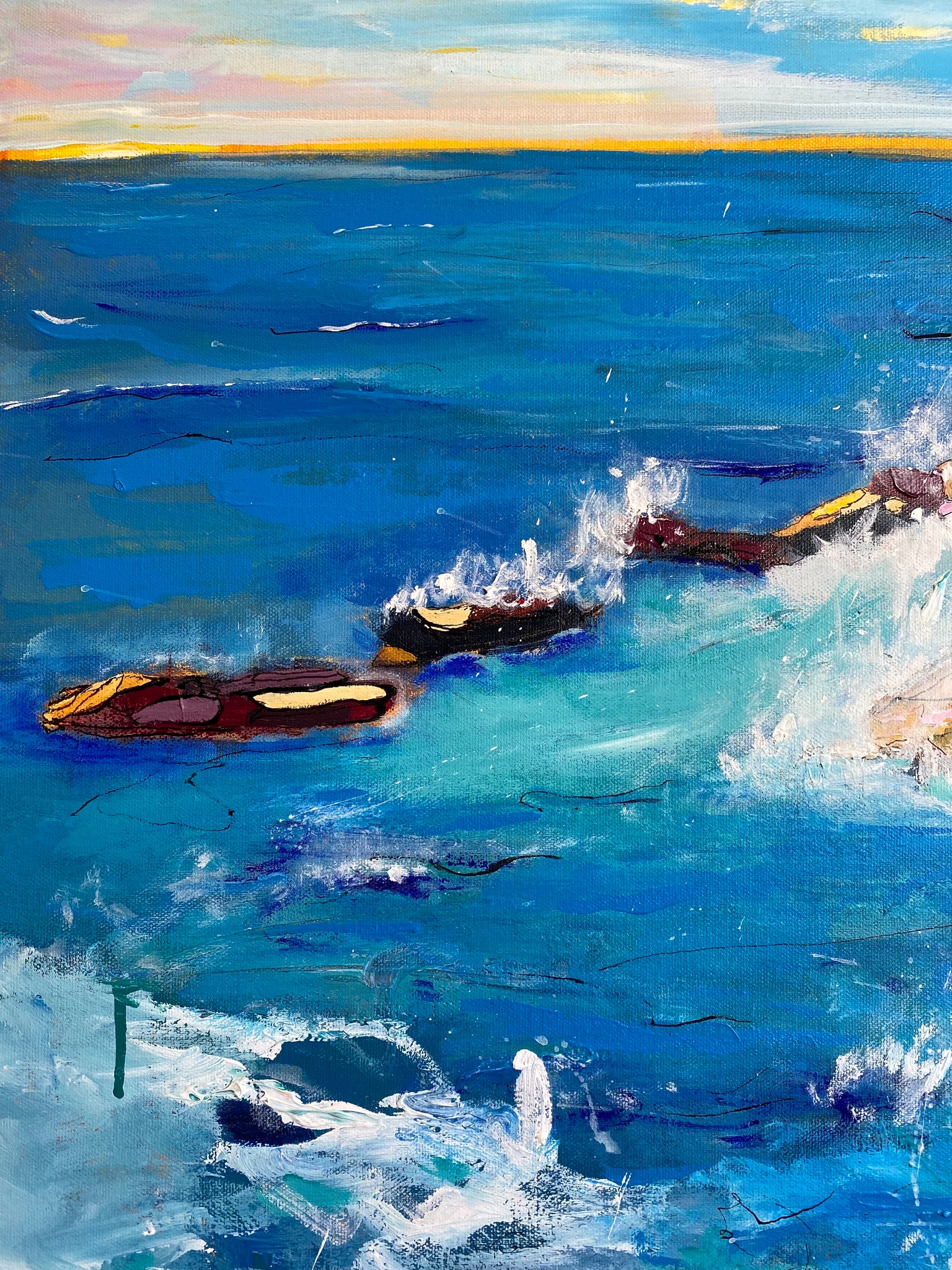 My inspiration for Good morning Bronte is the absolute delight felt when visiting this beautiful place. For some it’s that early morning exhilarating swim with mother nature crashing over the edge of the pool. For others it’s looking out to sea. For me it’s the movement of the water and life around the rocks. It’s mesmerising and I can sit and watch it for hours. The smell, the taste and the cool air beg me to paint it. It tempts me to feel it.