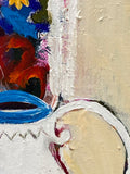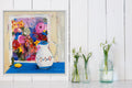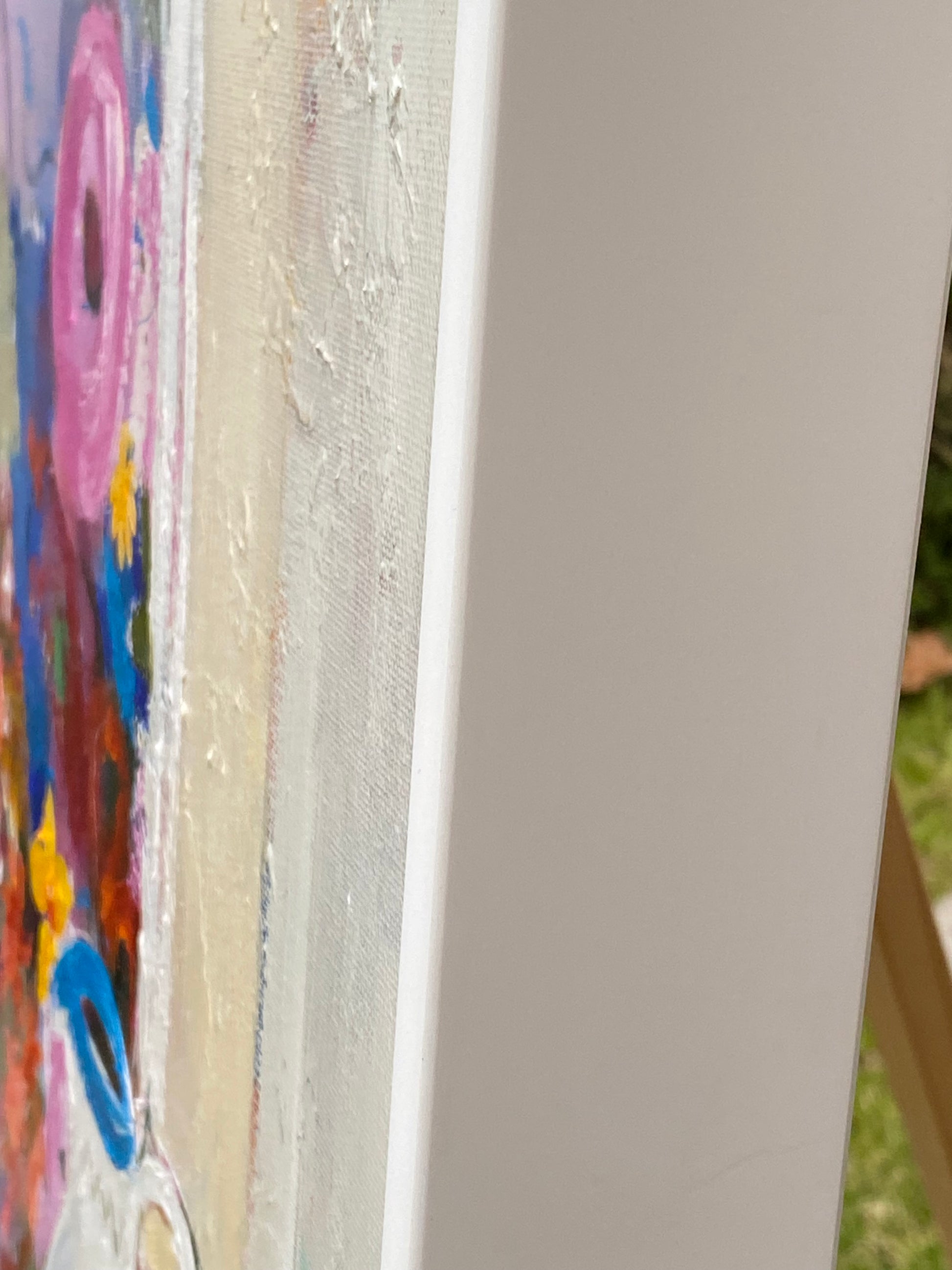 Comes framed in a white float frame with a wire across the back ready to hang.