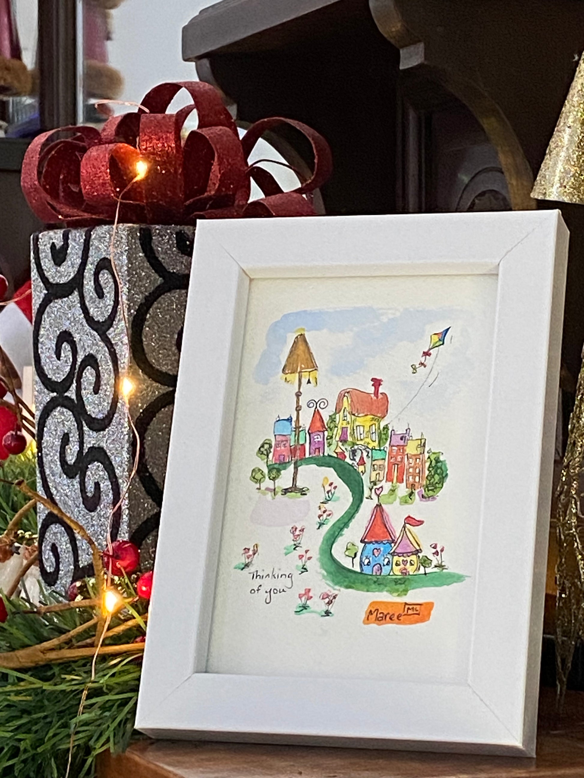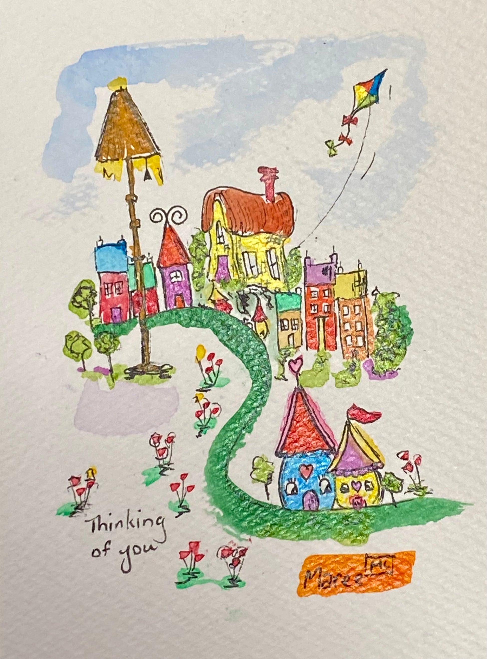 This fabulous little watercolour is for that person who lives far away, or maybe close by. The one who needs a little lift to let them know they’re not alone. Are you and they the little two houses huddled at the front? It’s a special original artwork. Art with meaning.