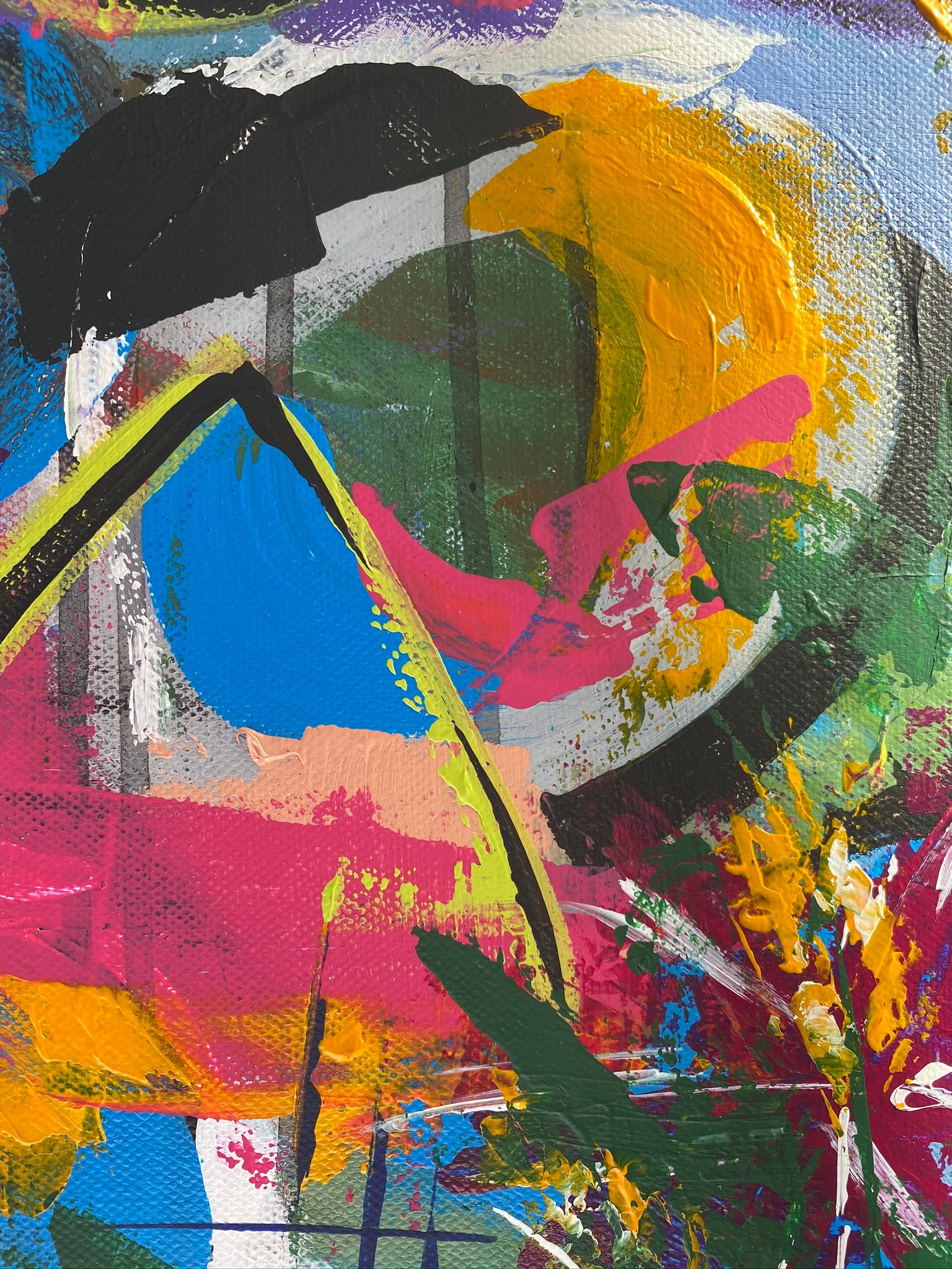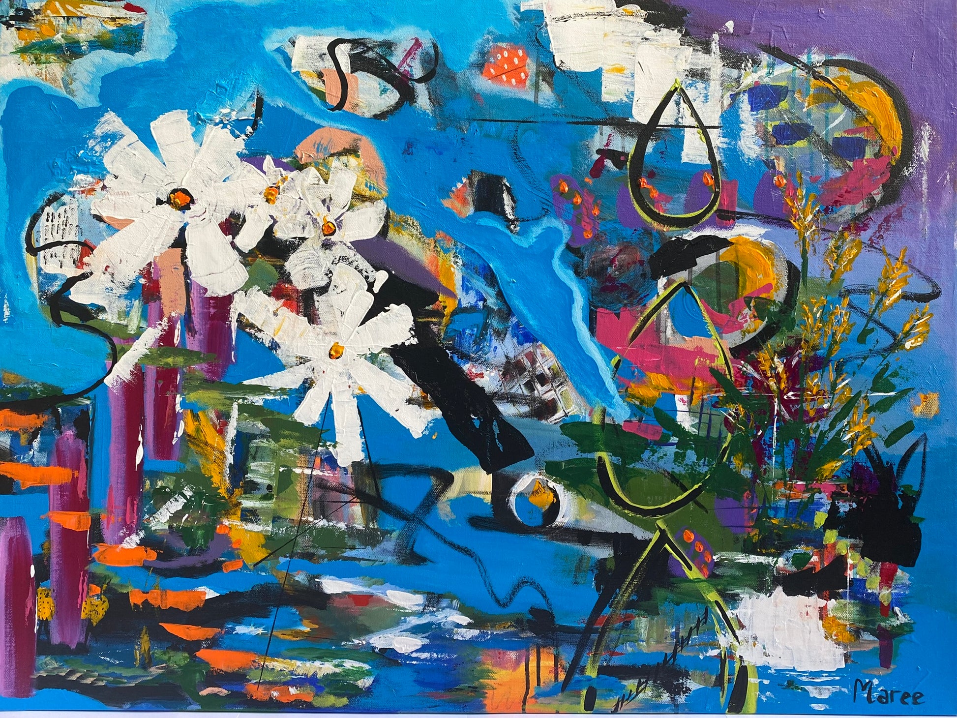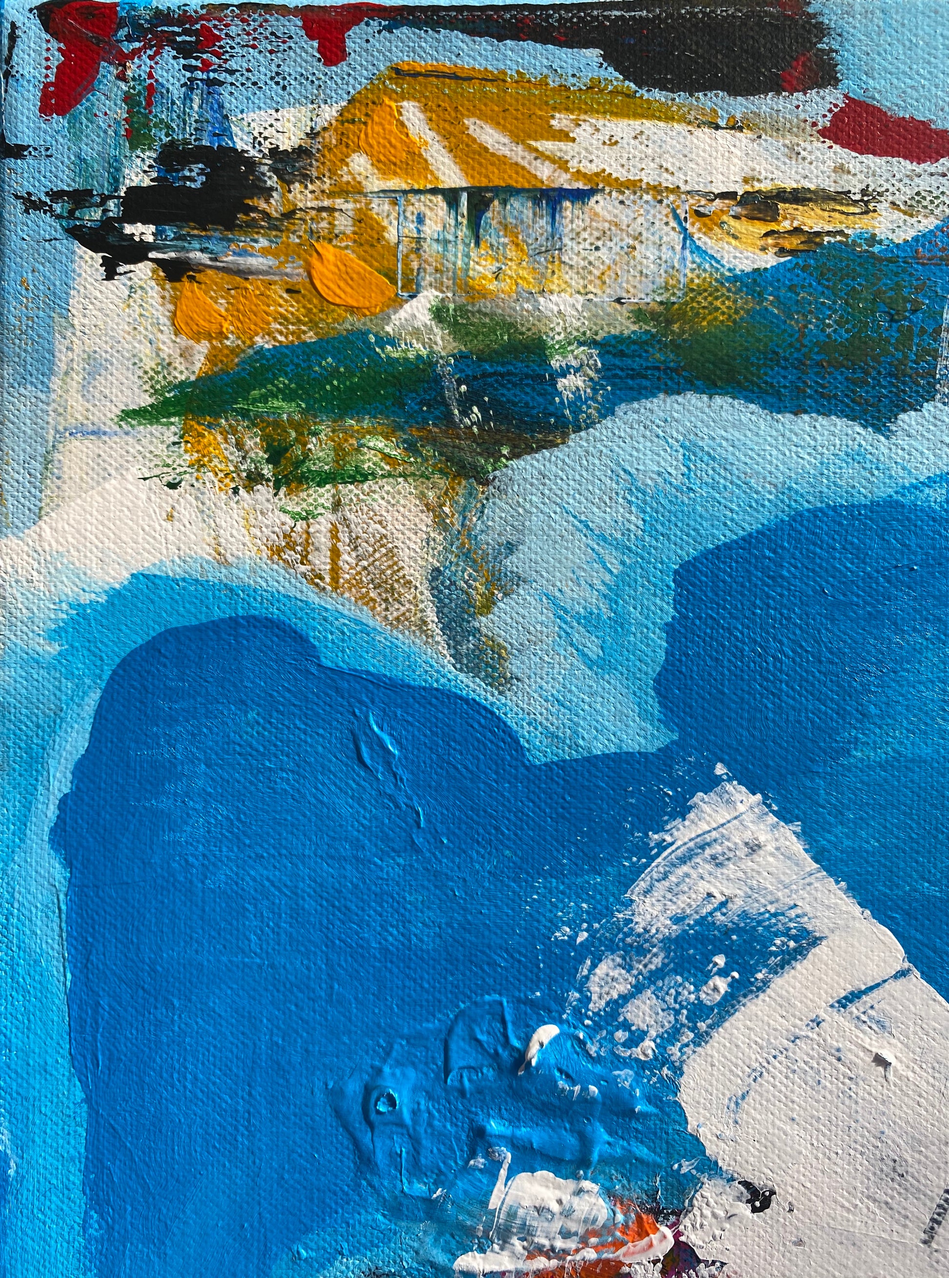 This mixed media painting is affectionately named “Wylgamere” (which is the name of the farm where I grew up near Burcher in central NSW, Australia). If you look closely it has little hidden memories eg, paddocks of green, machinery shed, old Austin truck, fence line, the dam windmill etc etc. And of course there are big drips of water - we always looked to Hughie for rain...’Send it down Hughie’.